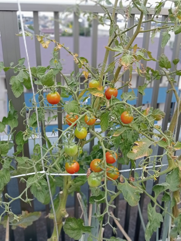 日の光を浴びてミニトマトも色づき始めてきました。ミニトマトも豊作です。