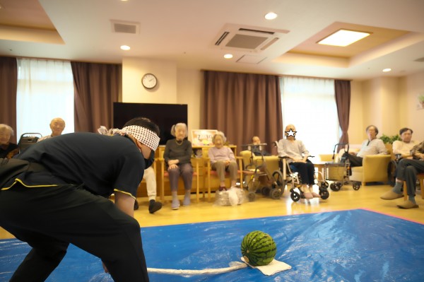 今回は毎年恒例のスイカ割りの様子をご覧いただきたいと思いますー!!