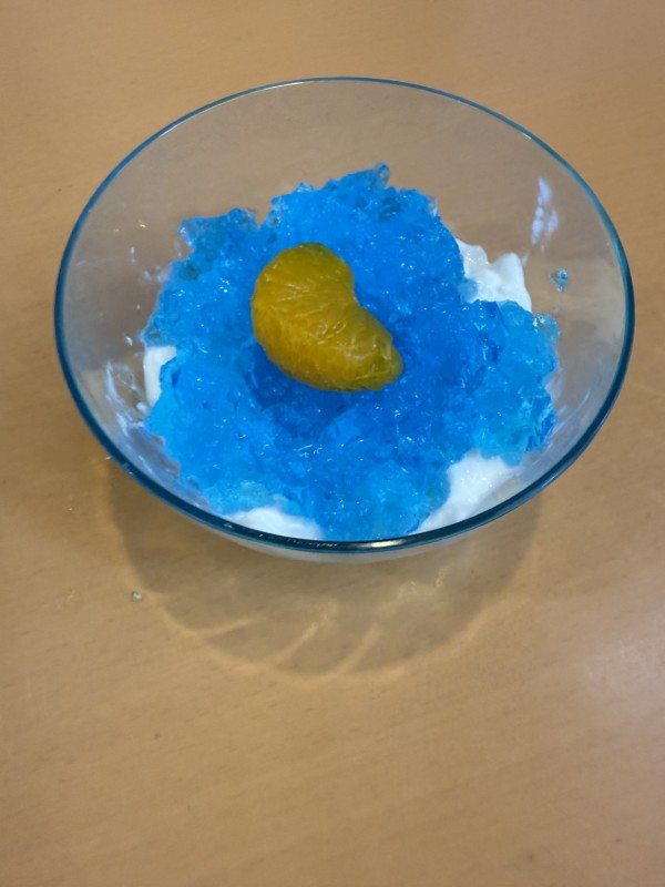 杏仁豆腐の上にゼリーを乗せて最後にミカンで飾りを付けて完成です!!