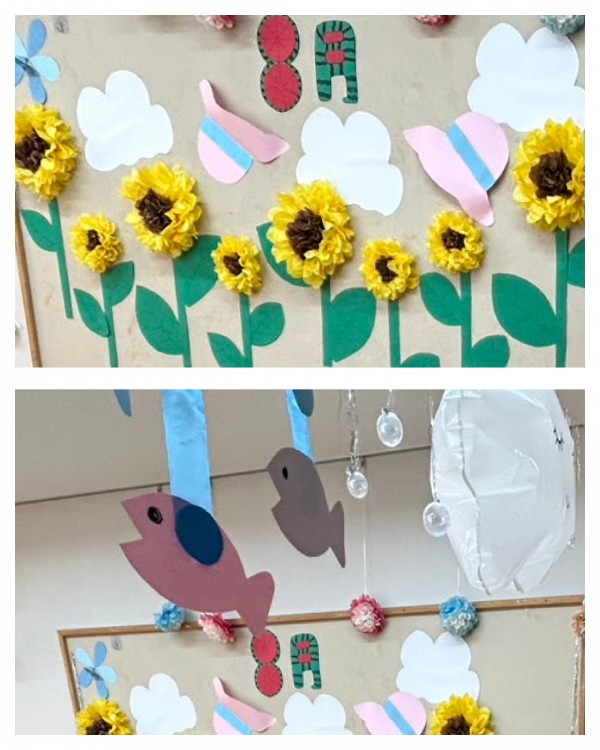 8月は壁一面にひまわりたちが手を振ってくれているような掲示物がとても可愛いです!