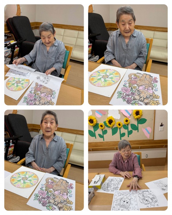 とても優しい色合いで塗って下さりましたᐠ( ᐢωᐢ )ᐟ塗り絵をお渡しした際には「可愛い!どれも良いわね!」と喜んで下さりましたヽ(✿❛◡❛)ノ