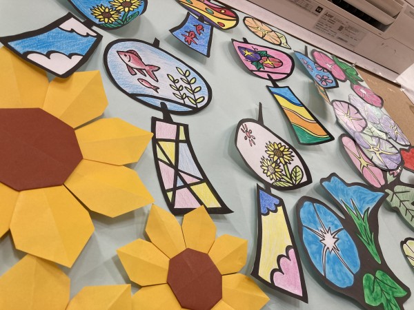 とても良い味を出しています。画用紙にはべったりと貼らずに冷房の風邪などで風鈴が揺れるように貼り付けてあります。