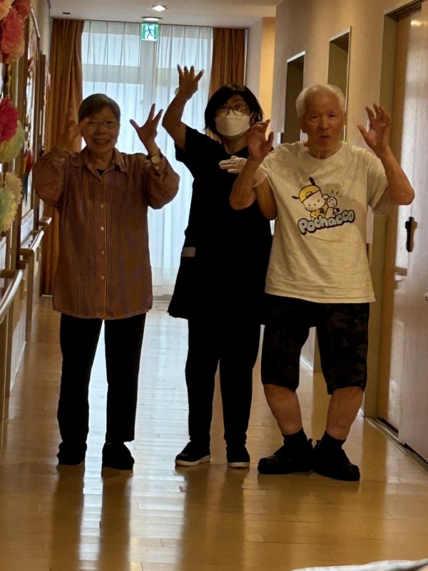 仲良しのご入居者様と職員がそろって元気ポーズ!
