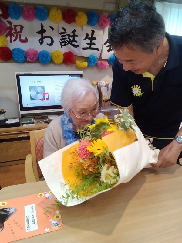 「百寿」の方へご家族よりメッセージカードが添えられた花束をプレゼント。