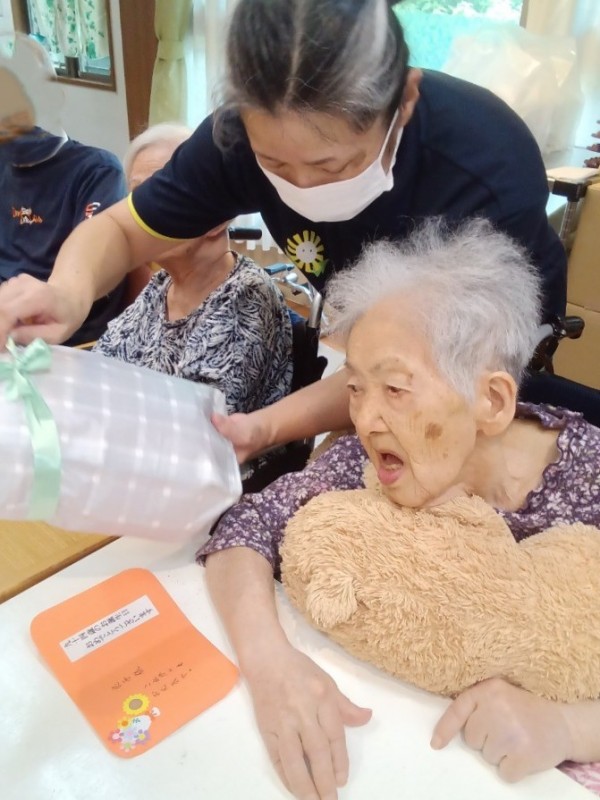 その後、94歳のE様、84歳のT様、82歳のM様へ職員より「バースデーカード」を読み上げて居室担当者からのプレゼントをお渡ししました。