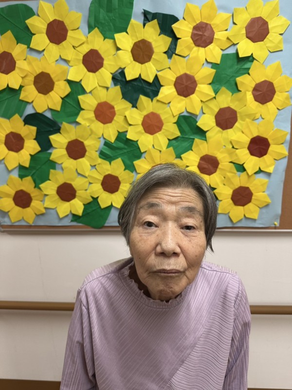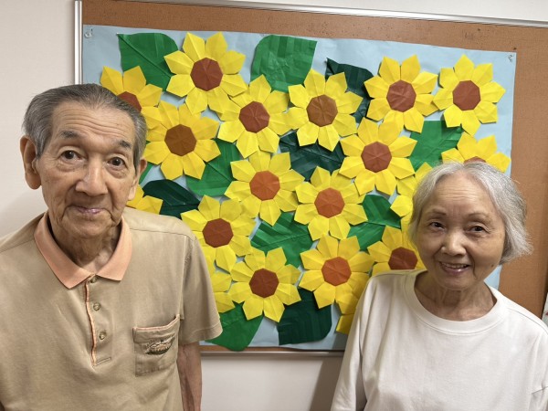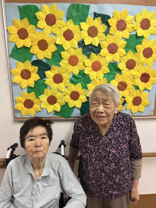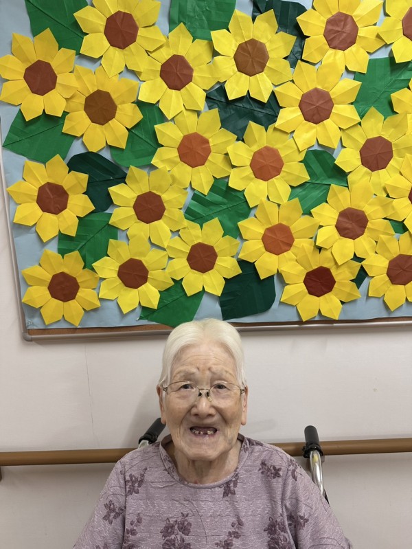 夏らしい『向日葵の壁面』の前で,笑顔でパシャリ♡