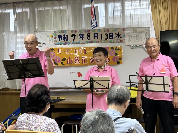 お馴染み【山茶花】の皆様にお越し頂き、ハーモニカ演奏会も開催されてました。ピンクのポロシャツも皆様お似合いです!今回も早口言葉から始まり、演奏は勿論のこと楽しいトークも充実していました!