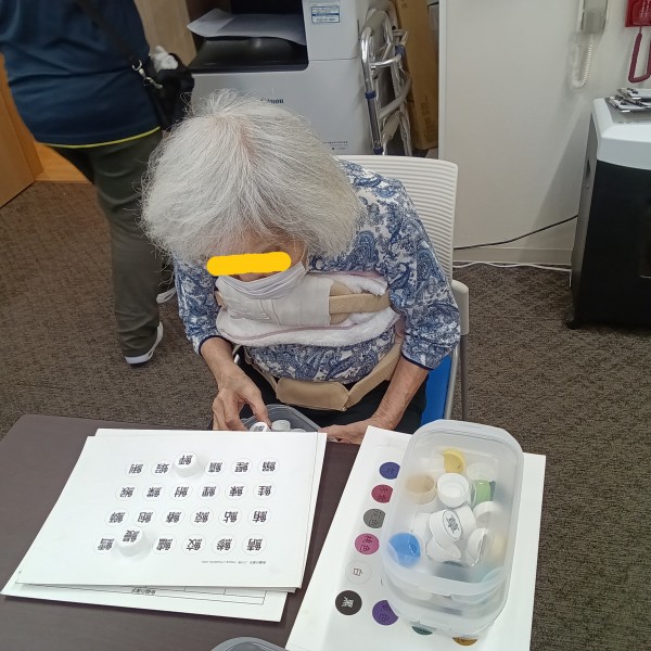 二枚目はペットボトルキャップに漢字が書いてあり、ボードの同じ漢字に重ねるという脳トレゲームです。
