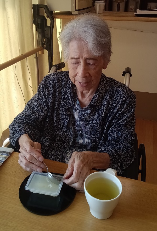 昨日、8月24日におやつレクを行いました。みなさまにわらび餅とくずもちの好きな方を選んで召し上がっていただきました。