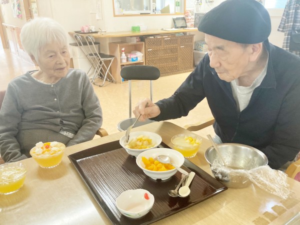 今回のポイントは、なんとペットボトルを使ってゼリーを作ったことです。ジュースと寒天を混ぜてペットボトルの中で冷やして固め、「ギュッ」と絞って器に注ぐと、中からとろ~りとゼリーが流れ出すユニークなおやつになりました。利用者様にもペットボトルを絞り傾けて注ぐお手伝いをしていただきました。仕上げにフルーツ缶と生クリームを添えると、華やかで食べ応えのあるデザートに完成しました。