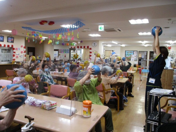 本日の午後は、ボールやセラバンドを使った介護予防運動を行いました。職員のかけ声に合わせ、皆様が一斉に体を動かす姿はとても活気があります。