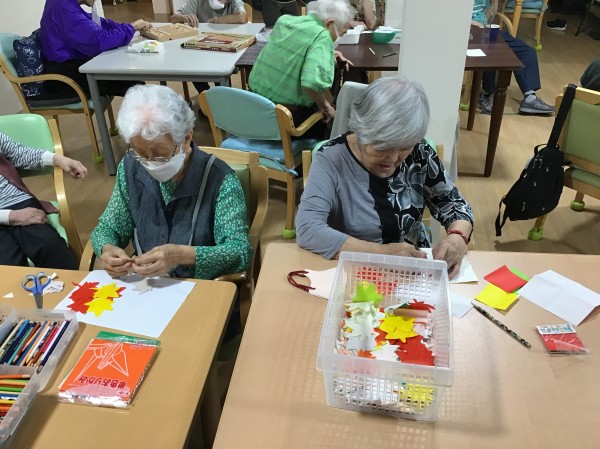 そこでかたくりでは一足早く秋を楽しめるようにとクラフト活動で紅葉の景色を作りました。