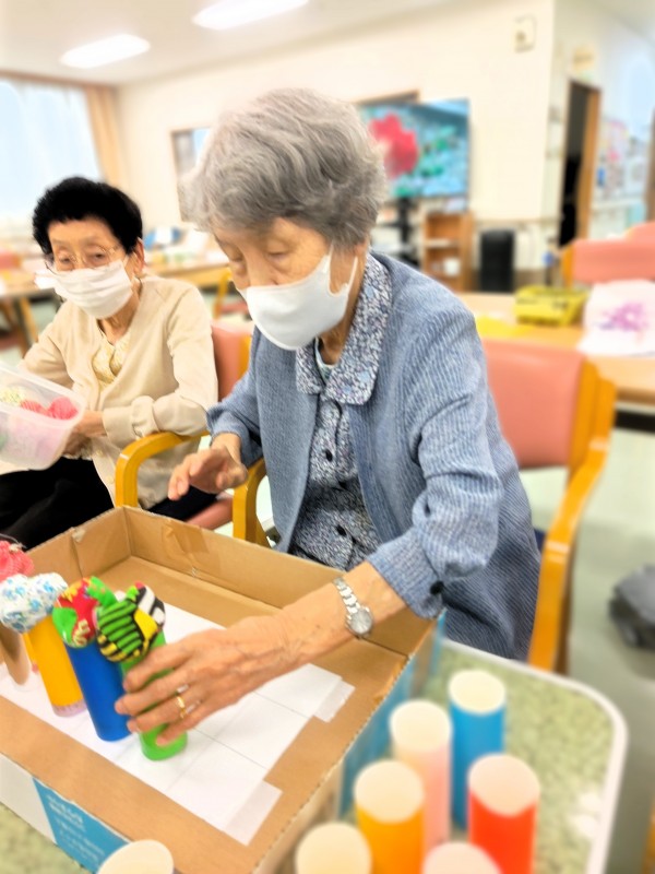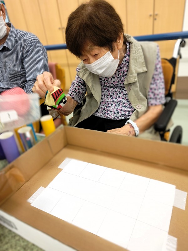制限時間内にお手玉を乗せたペーパー芯をマス目に並べていくというもの。