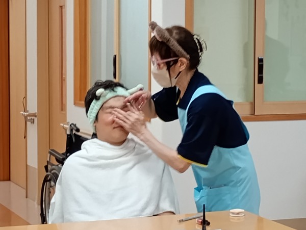 敬老会では二人羽織ならぬ…目隠しでお化粧♬