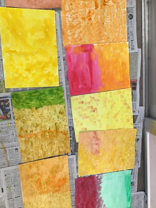 まずは絵の具を使って画用紙に秋の気配を感じる色で色を塗っていき、