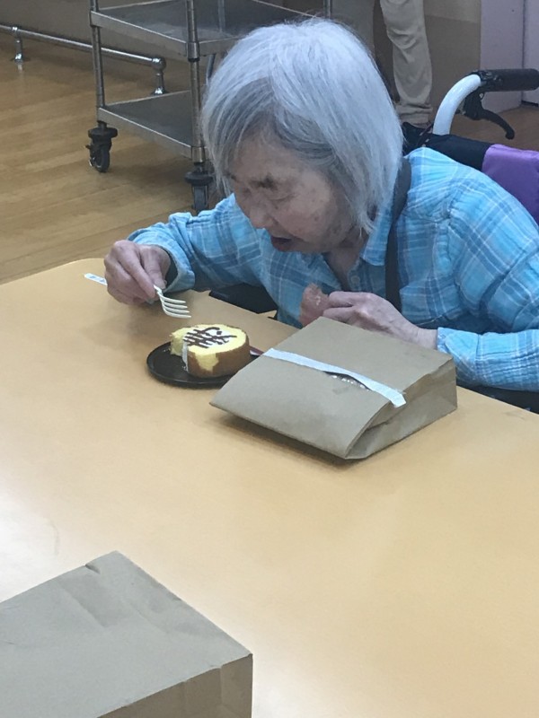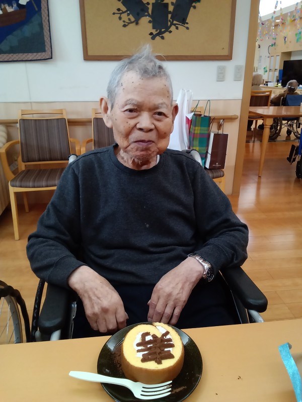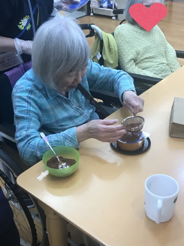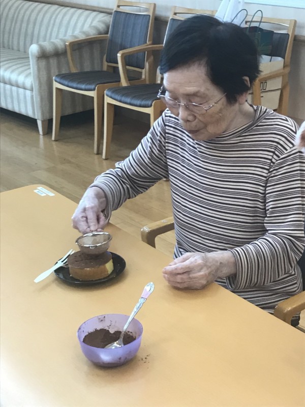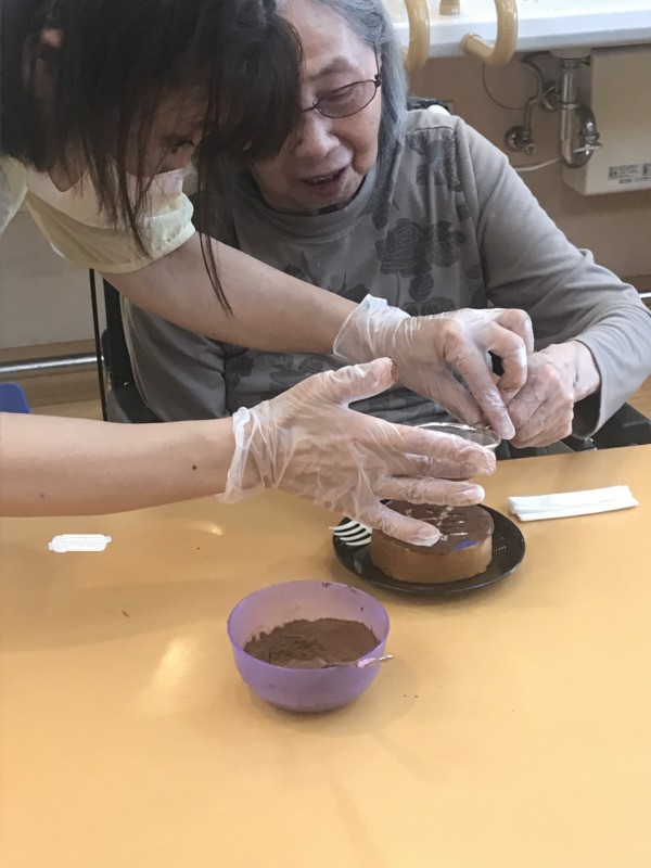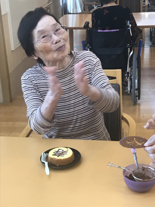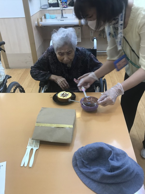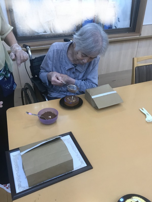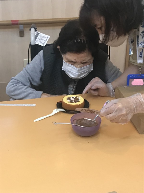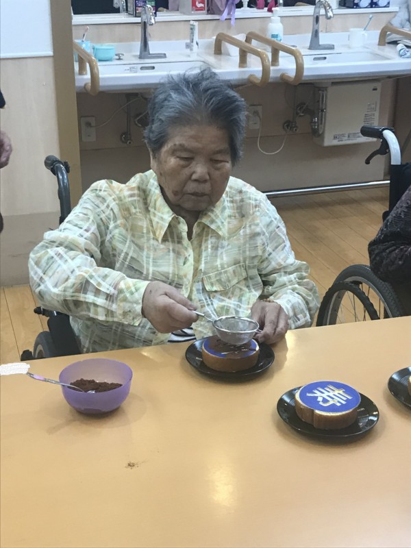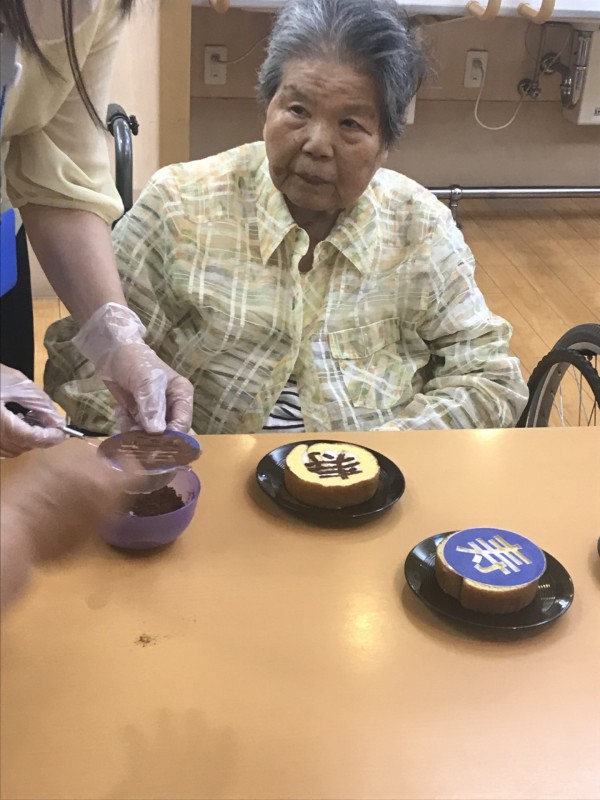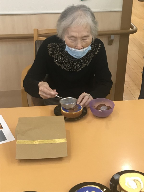 ロールケーキに「寿」の文字を自分で入れるおやつレクを計画しました(^^♪