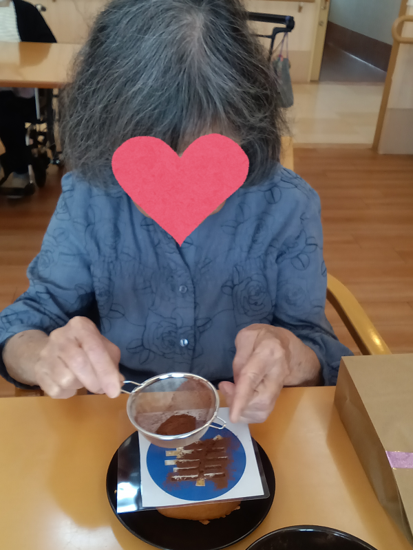 1階同様、「寿」の型をロールケーキに乗せてココアパウダーを振っていきます(^^♪