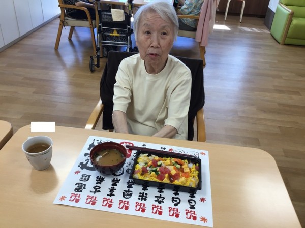 そう!お寿司♪皆さんに「何が食べたいですか?」とお聞きすると「お寿司が食べたいねー」と圧倒的大多数でリクエストNO1なんですよ♪ 今回は敬老会のお祝いで握りも良いけれど食べやすいバラちらしが昼食に並びました。