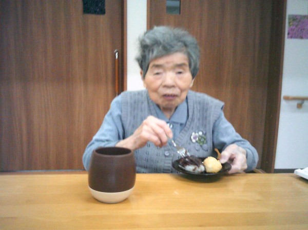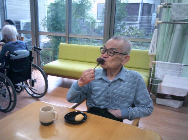 おはぎを召し上がられています( ^ω^)・・・ 餡子ときな粉の2種類を作りました。 美味しいね! 作ってくれたの?