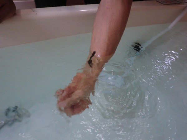 この腕に書いた油性マジックがなんと!ものの3分程湯につかることでまっさらに消えてしまいました!