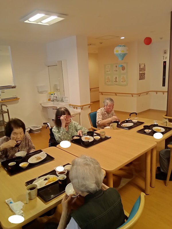 笑顔溢れる食事風景です。これからも、皆様が安心して笑顔でお過ごしいただけますよう、職員一同、心を込めてお手伝いしてまいります。これからも健やかに、穏やかに毎日をお過ごしください。