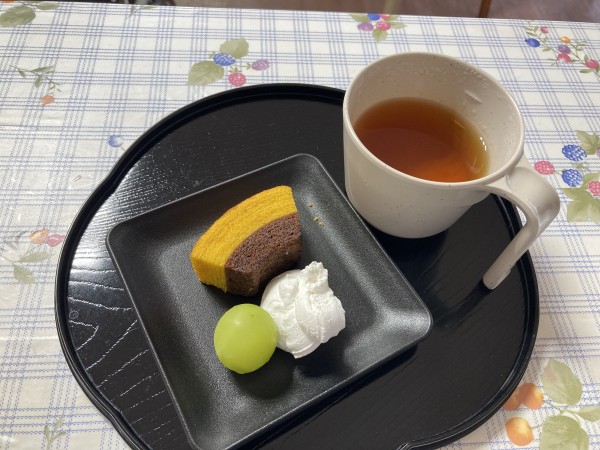 この日のおやつは、カボチャバームと差し入れシャインマスカットに生クリーム添えたもの。お店で出てきそうな見た目。