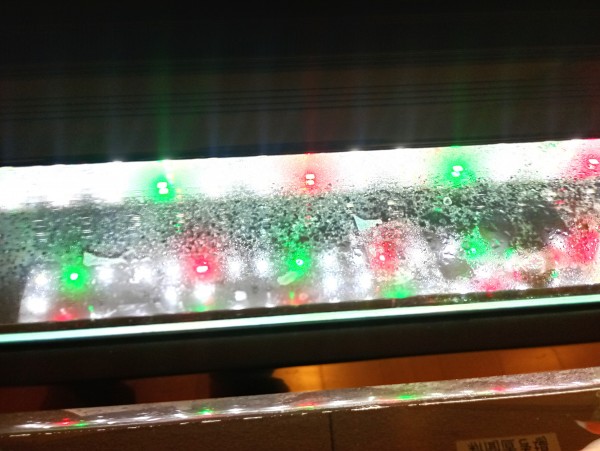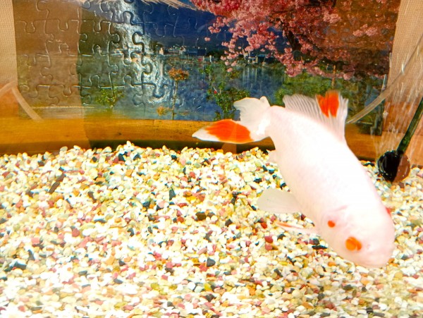 2階のホール食堂内にて水槽の中で優雅に泳いでいる