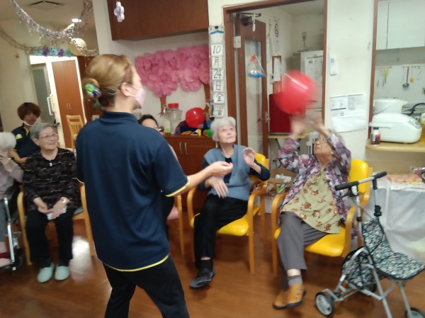 開催前から風船バレーの練習をしながら