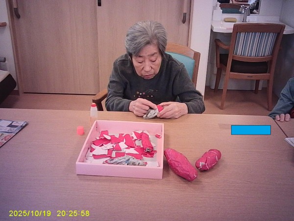 新聞紙をさつま芋の形にして小豆色の折り紙を小さくちぎってのりを付けて貼っていきます