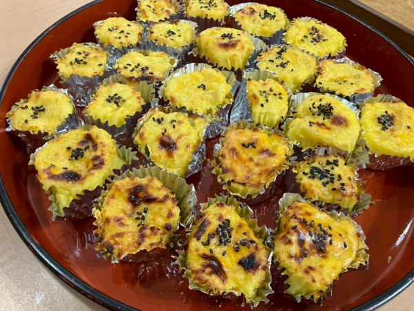 2キロのさつまいもを茹で、みんなで分担してしっかりと潰していきました。潰すのは、得意よ!とニコニコしている方や疲れたから代わって!と隣に早く回す方・・・皆さんとにかく楽しそうでした(๑˃̵ᴗ˂̵)