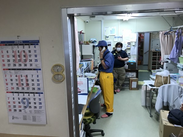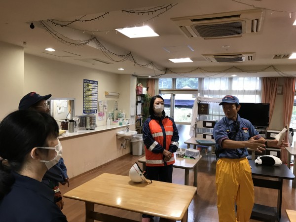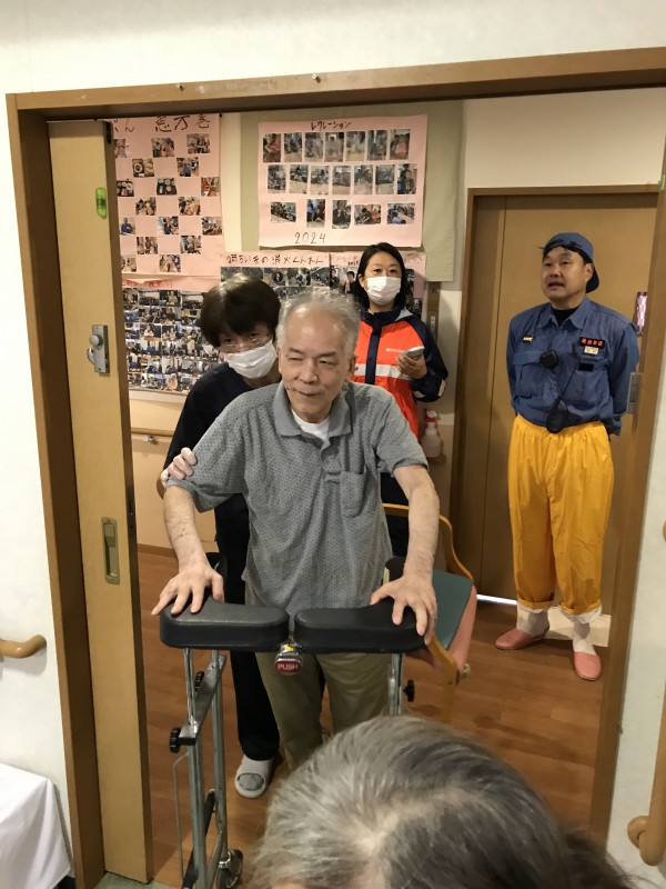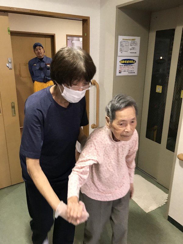 今回は日中帯に地震が発生し2Fのキッチンから出火という想定で行いました。日中帯なので職員さんは各階2名居るので分担して行動しています。