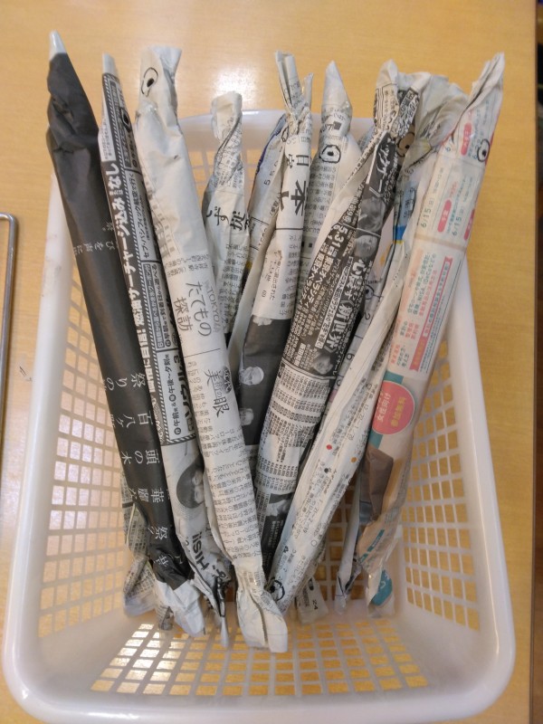 まずは新聞紙をくるくる丸めて形を作りました。