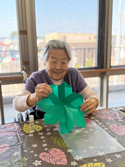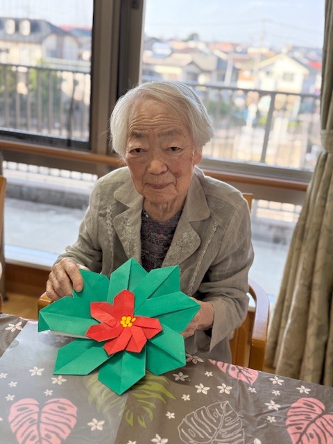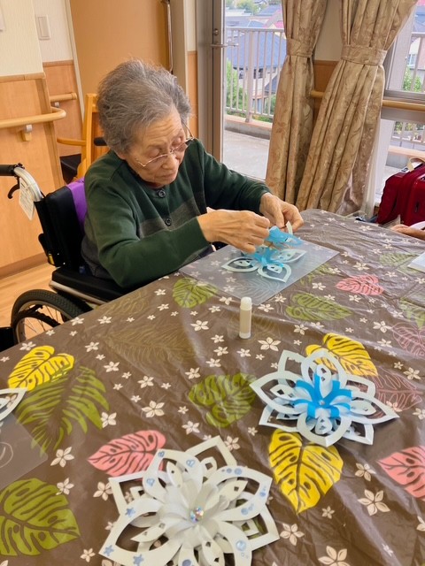 1階の利用者様は雪だるま、2階ではポインセチア、3階では雪の結晶を作りました