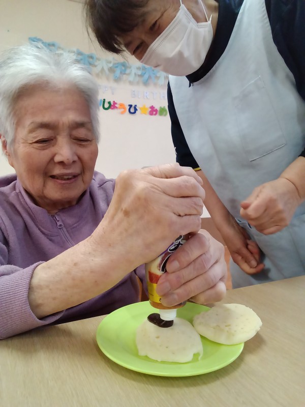 職員が焼いたパンケーキに餡子を付けて挟んで・・・どら焼きの完成!!