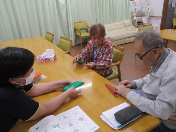 今日は折り紙で動物や鳥を折りました。 折っているご様子をお知らせいたします!! スタッフに教えてもらいながら真剣に作られておられました????