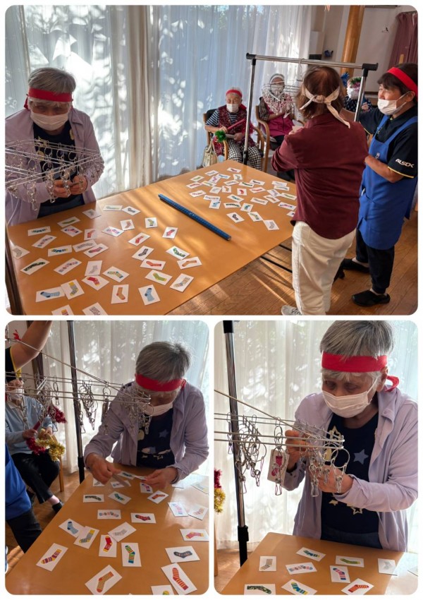 テーブル上にばらまかれた靴下をペアにして干す!!