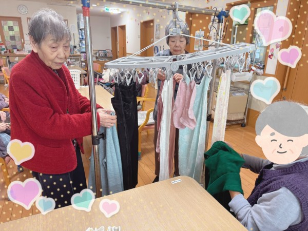 職員と一緒に干していると「私も一緒にやろうか?」とY様も来られたのでお願いすることに…