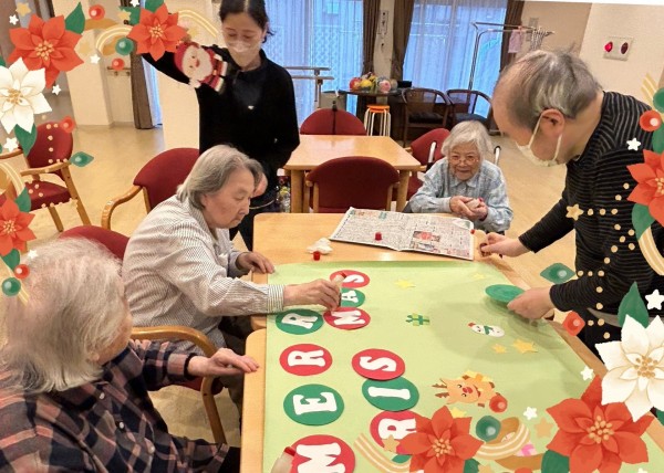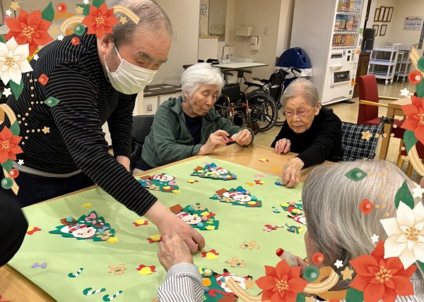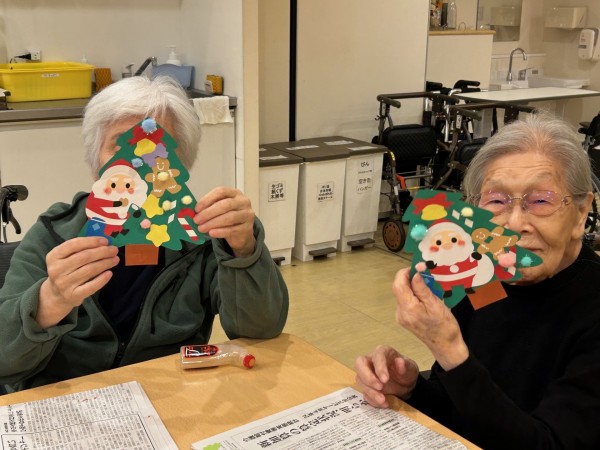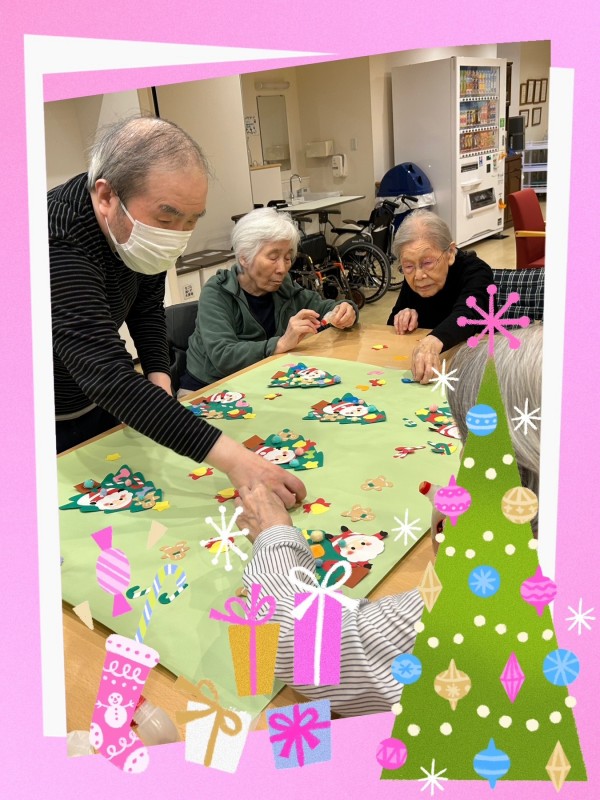 アミカの郷ちとせでも、入居者の皆さまと一緒にクリスマスの準備を始めました。今年は、手作りのサンタさんやプレゼントを飾ったもみの木の壁絵アートを、2つ作成しました。