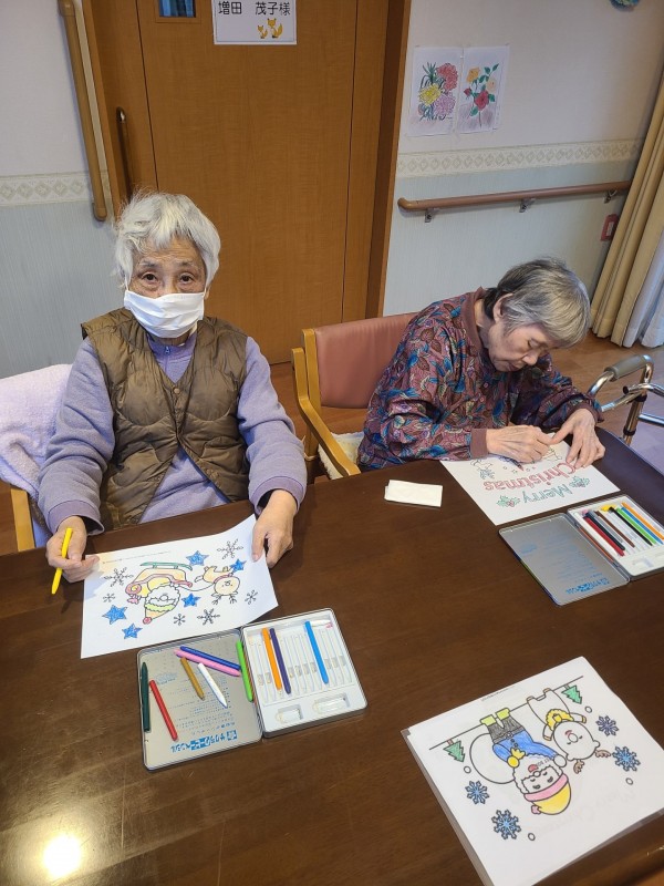 先日クリスマスの塗り絵レクリエーションを行い、入居者様それぞれの感性で色鮮やかな作品を完成させてくださいました