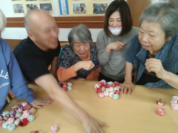 昔は五つ位は出来たのにー。や、小さいからやりにくい…などと言いながらも、皆さん上手にお手玉をされていました(*^-^*)