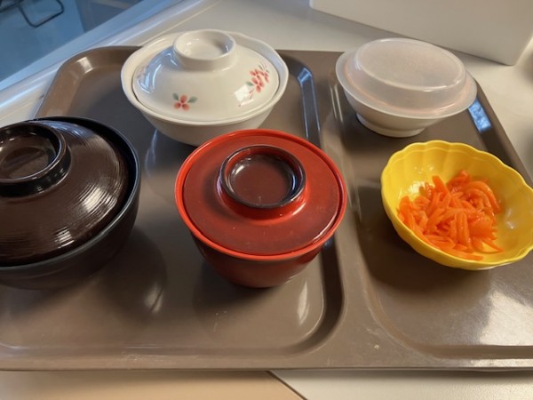 食器は料理の温度を保持する素材のもので、通常はトレーでご提供致しますが、イベント食や行事食などでは、彩りを感じさせるマットなどを使用し、皆様が目で見て楽しさや嬉しさなども味わっていただけるよう工夫しております。