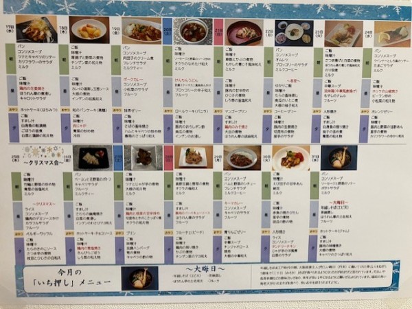 2025年(令和7年)12月の献立一覧です。ご家族様やご友人もご一緒にお食事されたいなどご要望ございましたら、アミカの郷草加谷塚にご相談ご連絡ください。