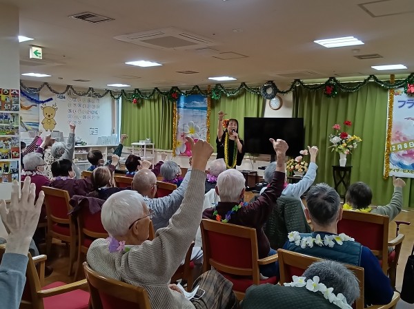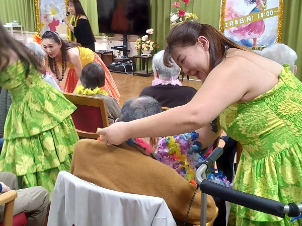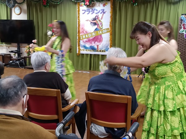 今回はなんと、ご利用者様の娘様より「両親に自分のやっているフラダンスを見せたい」とのご要望があり、是非とも!とこの企画へと繋がりました。