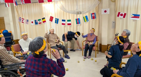 いきおいよく投げるご利用者様達と落ちた球を拾いまくるスタッフ