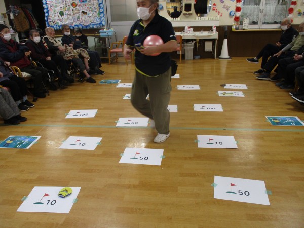 「思った方向に行かないな」「力加減が難しいね」と、皆様真剣な表情。ボールが高得点の位置に止まると、自然と拍手が起こり、ホールは大いに盛り上がりました。3回打った合計点を競うゲーム形式で、一打一打に集中しながらも、笑顔と声援があふれる時間となりました。