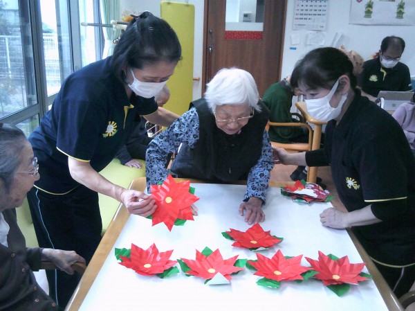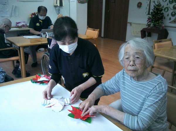 ポインセチアの貼り絵を行っているご様子です( ^ω^)・・・ 凄いね~! 大きなお花で綺麗ね! とビックリでした。