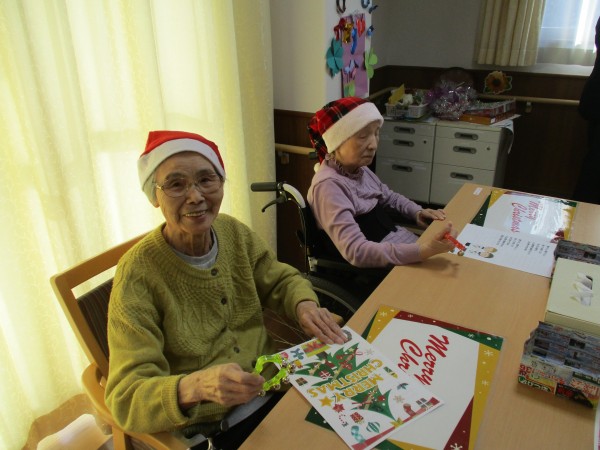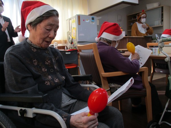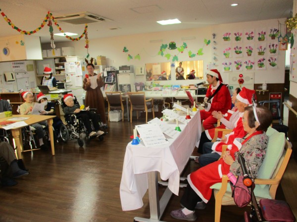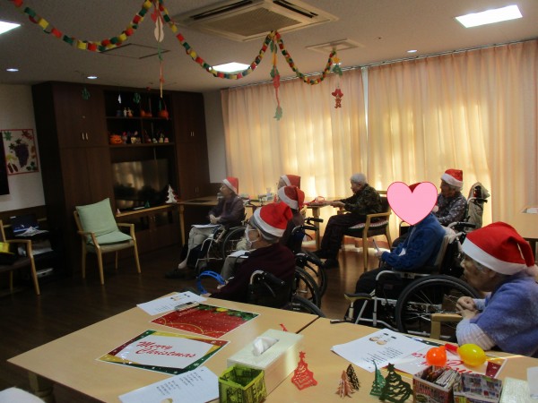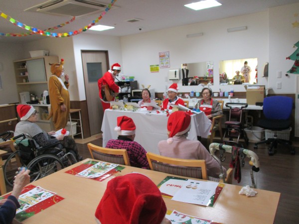 職員はサンタやトナカイ、雪だるまの服装をして、利用者様はサンタ帽をかぶって準備万端!