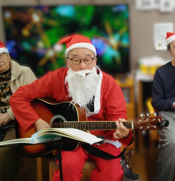 サンタクロースに扮したホーム長のギターで合唱がスタート♪