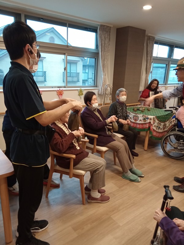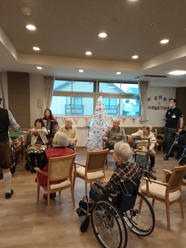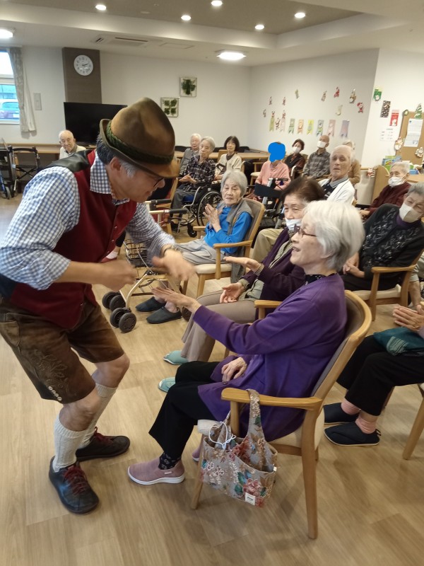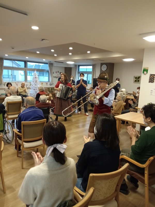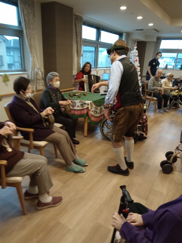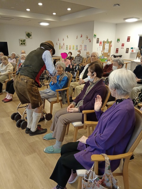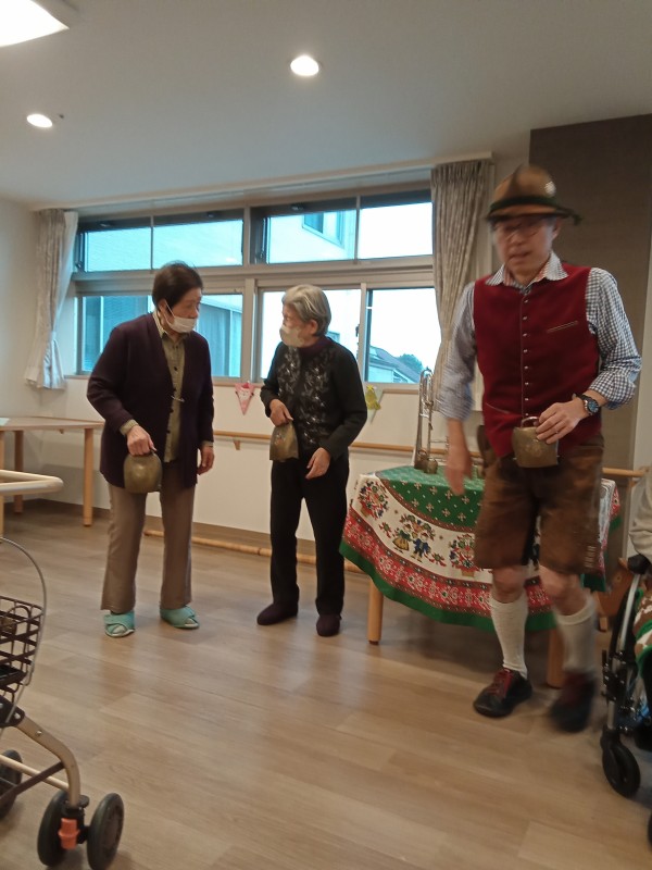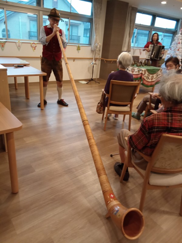 アルプホルンはとても長い楽器で、入居者様も職員も興味津々でした。