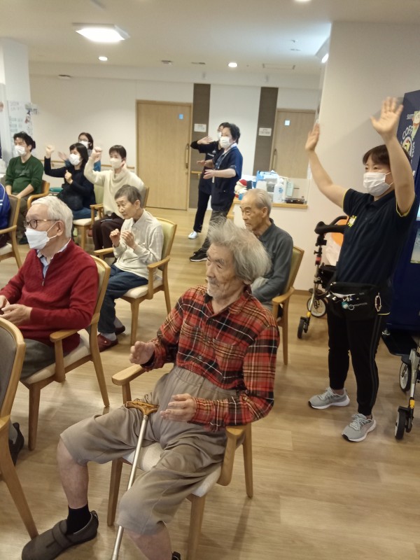 椅子に腰かけたまま、リズムに合わせて手を動かしました。